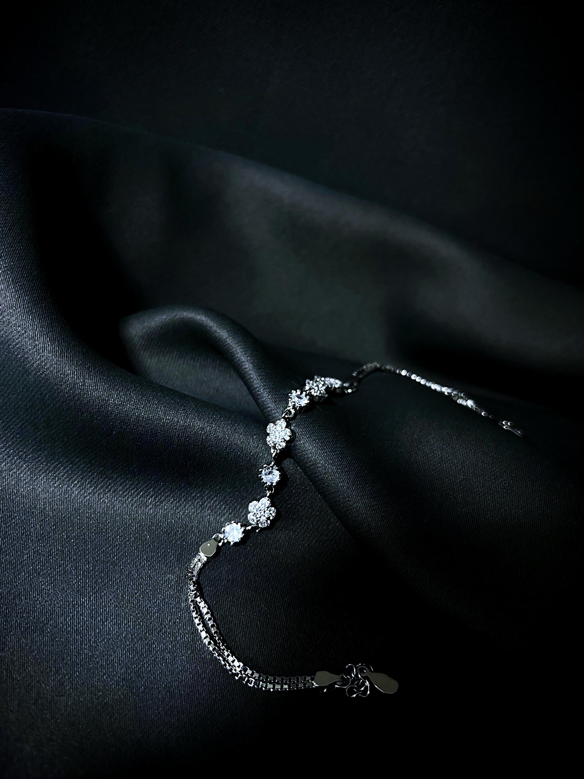 Dieses Armband aus 925er Silber mit Platinveredelung präsentiert eine Reihe zarter Blumen, die im Licht funkeln. Die Blumen symbolisieren Wachstum und Erneuerung, und die funkelnden Steine verleihen deinem Stil einen Hauch von Frische und Eleganz