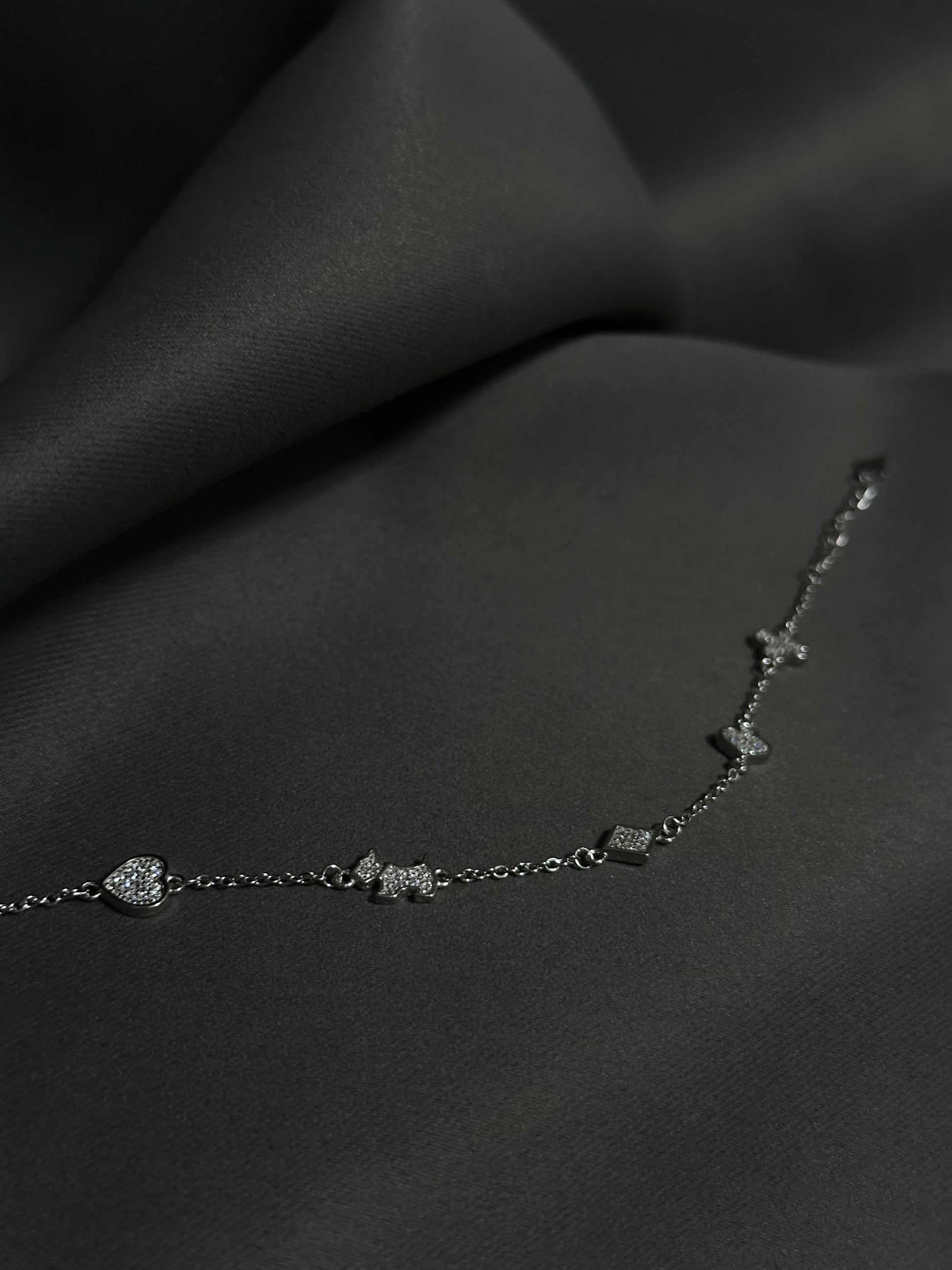 Das Kartensymbole Armband aus 925er Silber, veredelt mit Platin, kombiniert die vier Symbole des Kartenspiels – Herz, Pik, Karo und Kreuz – zu einem stilvollen und spielerischen Design. Es steht für Glück, Abenteuer und die Freude am Leben, ein Accessoire, das sowohl Mut als auch Stil ausdrückt.